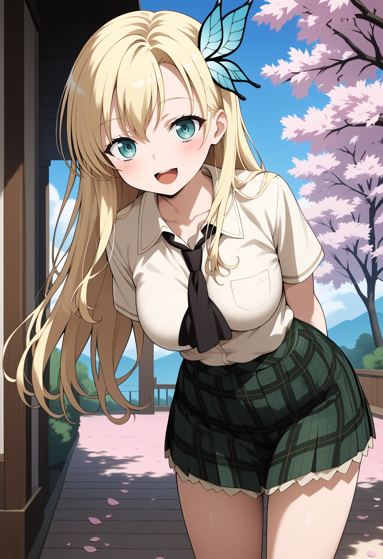 outfit2aasena, long hair, blonde hair, hair ornament, aqua eyes, breasts, school uniform, black necktie, collared shirt, white shirt, short sleeves, shirt tucked in, plaid skirt, green skirt