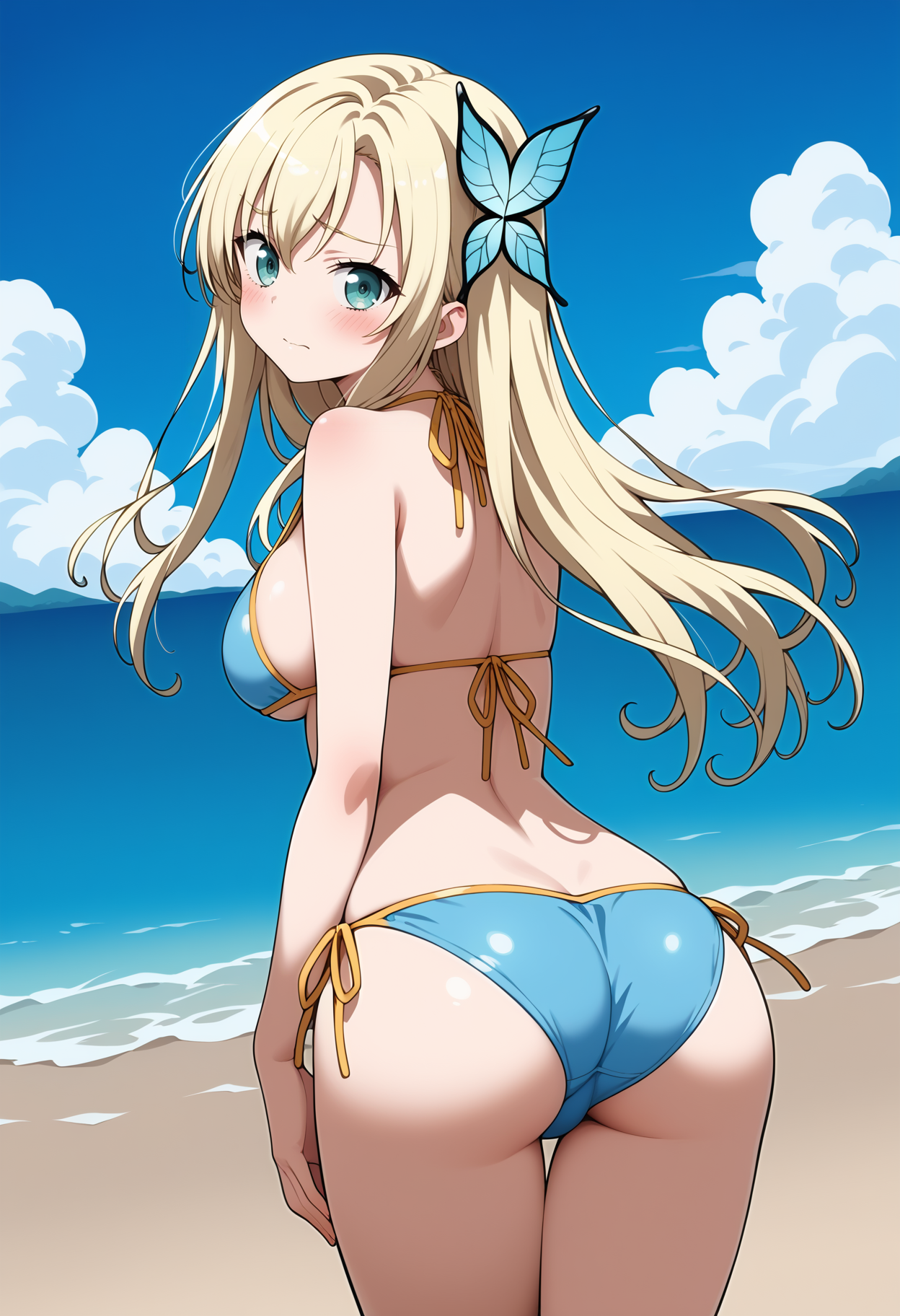 outfit4aasena, long hair, blonde hair, hair ornament, aqua eyes, breasts, cleavage, string bikini, blue bikini, front-tie top, side-tie bikini bottom