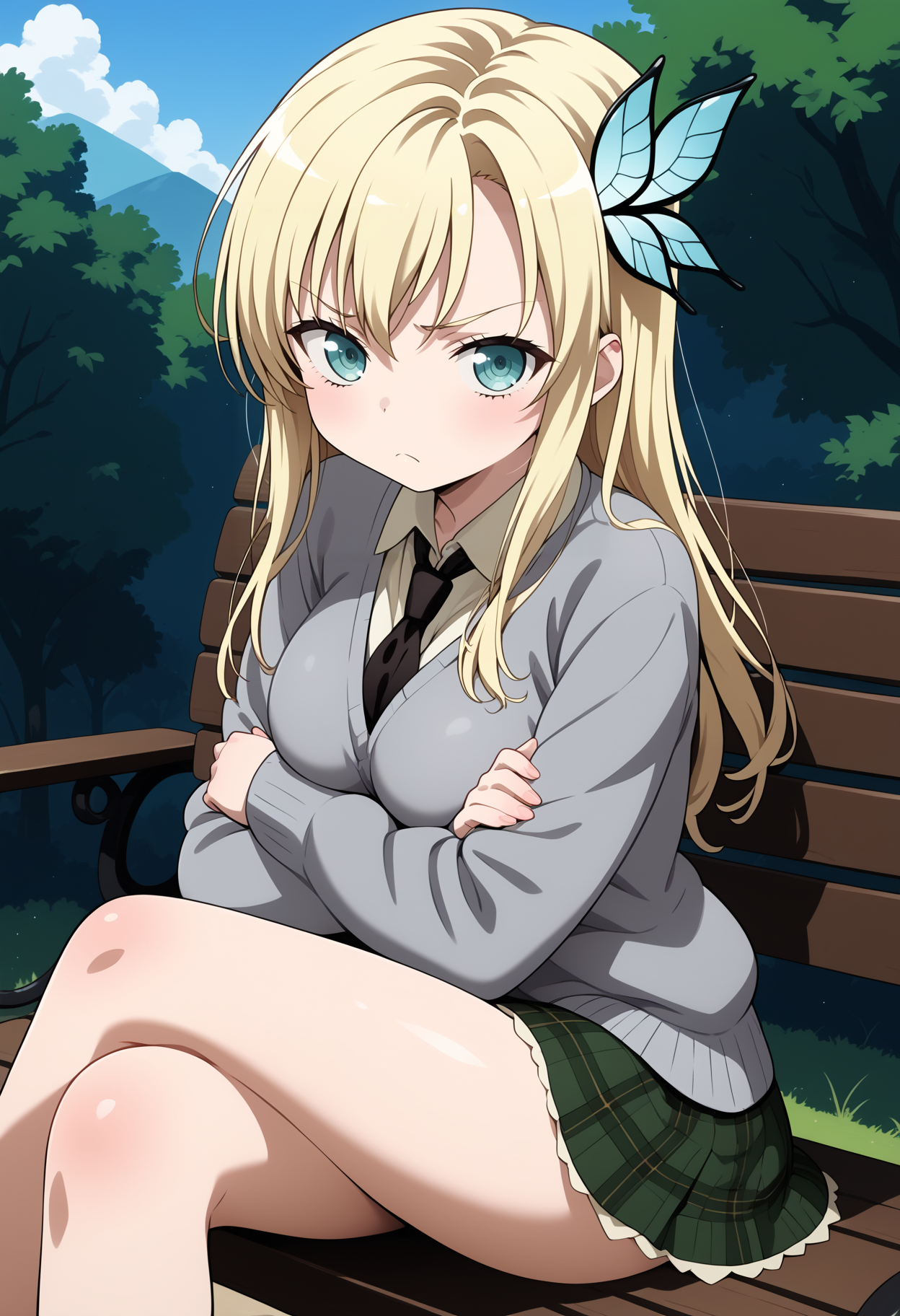 outfit3aasena, long hair, blonde hair, hair ornament, aqua eyes, breasts, school uniform, black necktie, grey cardigan, long sleeves, plaid skirt, green skirt