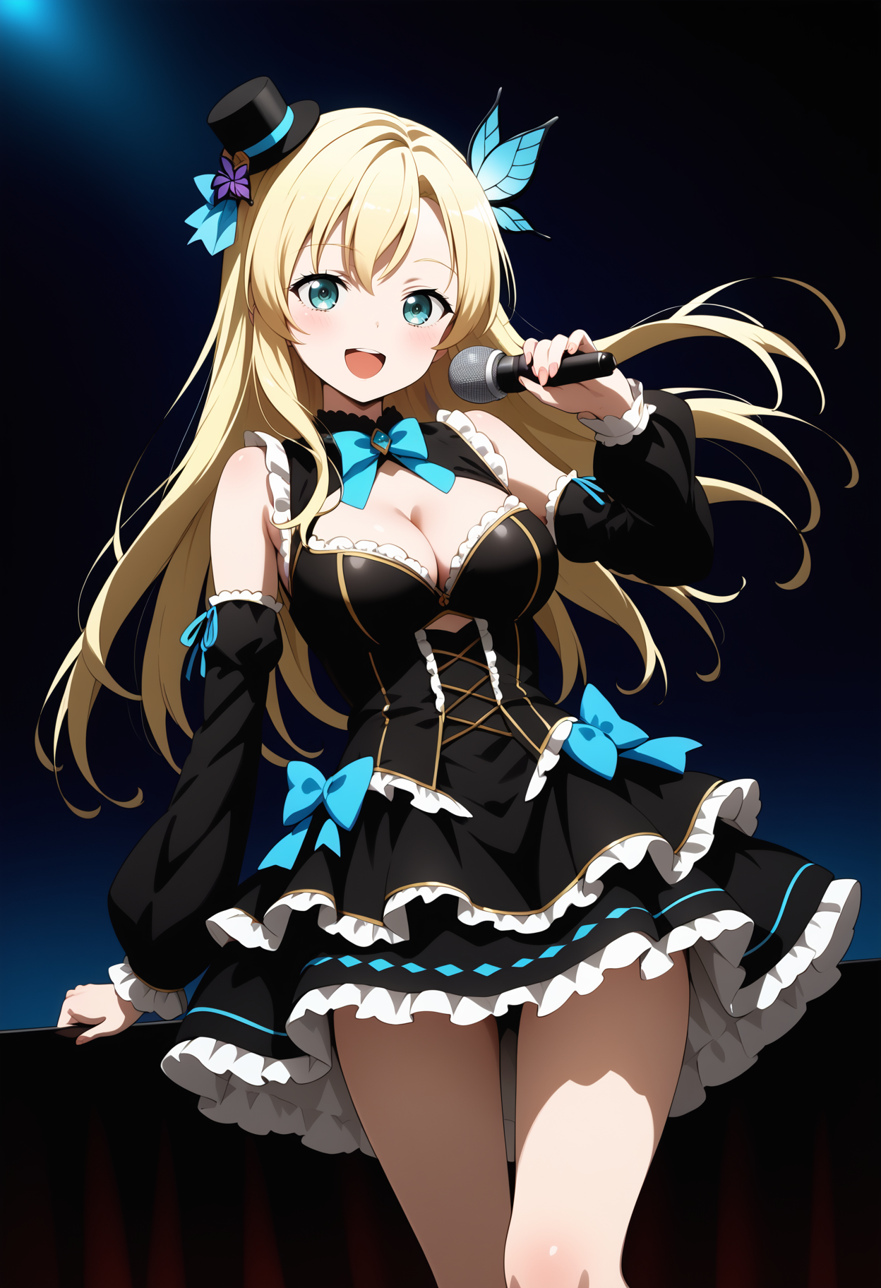 outfit1aasena, long hair, blonde hair, hair ornament, aqua eyes, breasts, school uniform, black necktie, blazer, green jacket, long sleeves, plaid skirt, green skirt