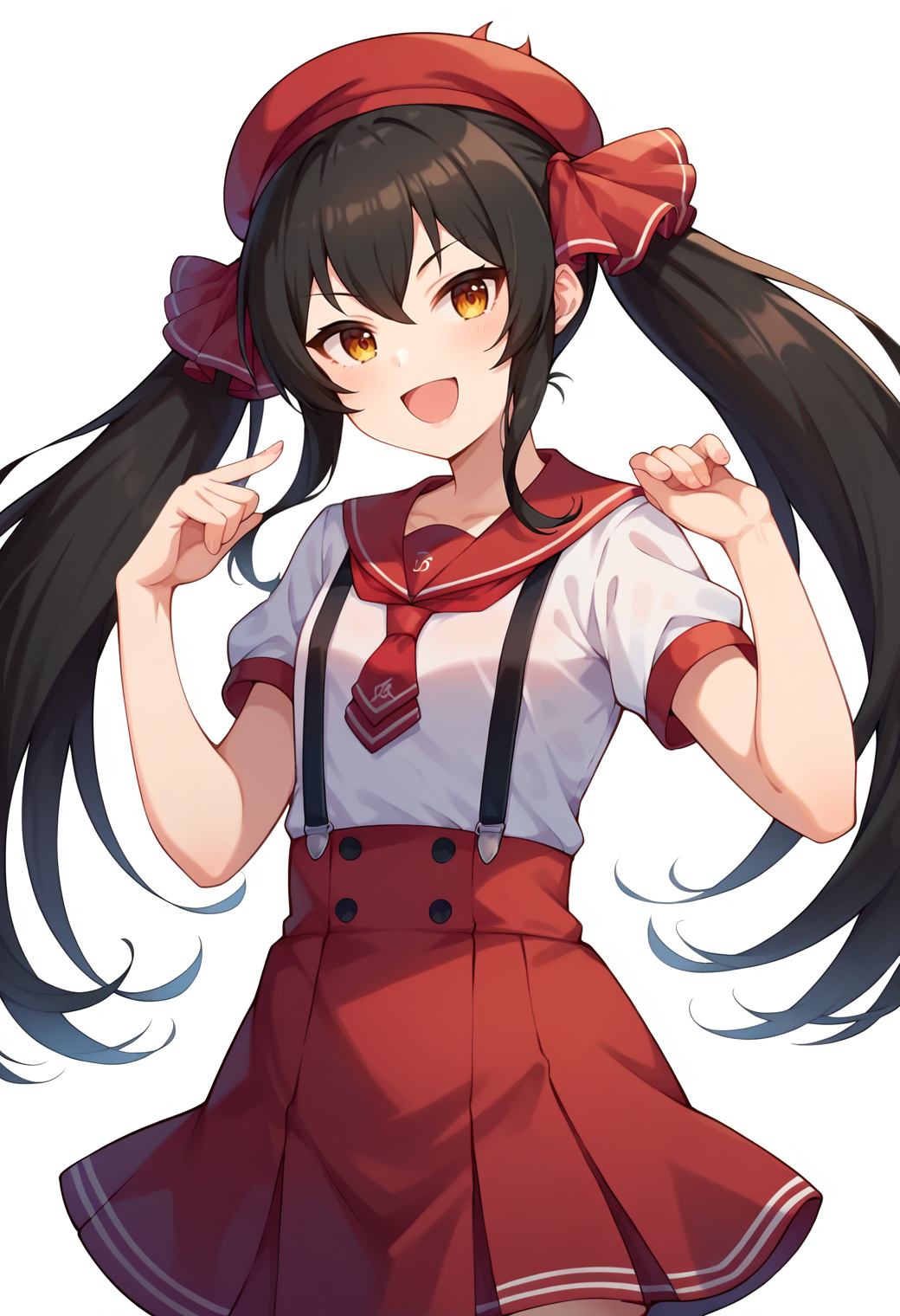 - risamasbase, 黒髪, ツインテール, ambteeuniform, 学校制服, ベレー帽, 赤いセーラーカラー, 赤いリボン, ヘアリボン, 赤いリボン, 短袖, ネクタイ, プリーツスカート, 赤いスカート, サスペンダー, サスペンダースカート, 白い靴下, メリージェーン, 黒い靴,
