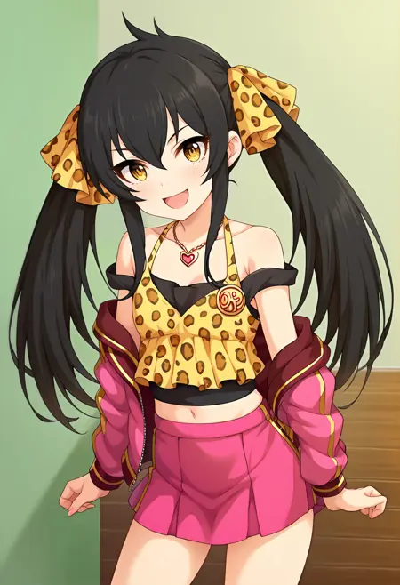 - risamasbase, 黒髪, ツインテール, risadefclothes, ヘアリボン, ピンクのジャケット, ハートのネックレス, レオパード柄, レオパード柄のカミソール, オフショルダー, 肩出し, 中腹, ミニスカート, ピンクのスカート, プリーツスカート,