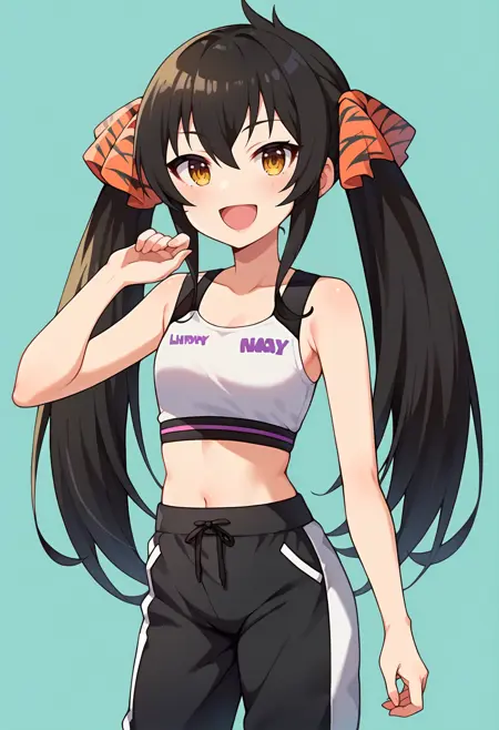 - risamasbase, 黒髪, ツインテール, risaaniwkclothes, ヘアリボン, オレンジのリボン, スポーツウェア, 白いクロップトップ, 中腹, 黒いズボン, トラックパンツ, 白い靴, スニーカー,