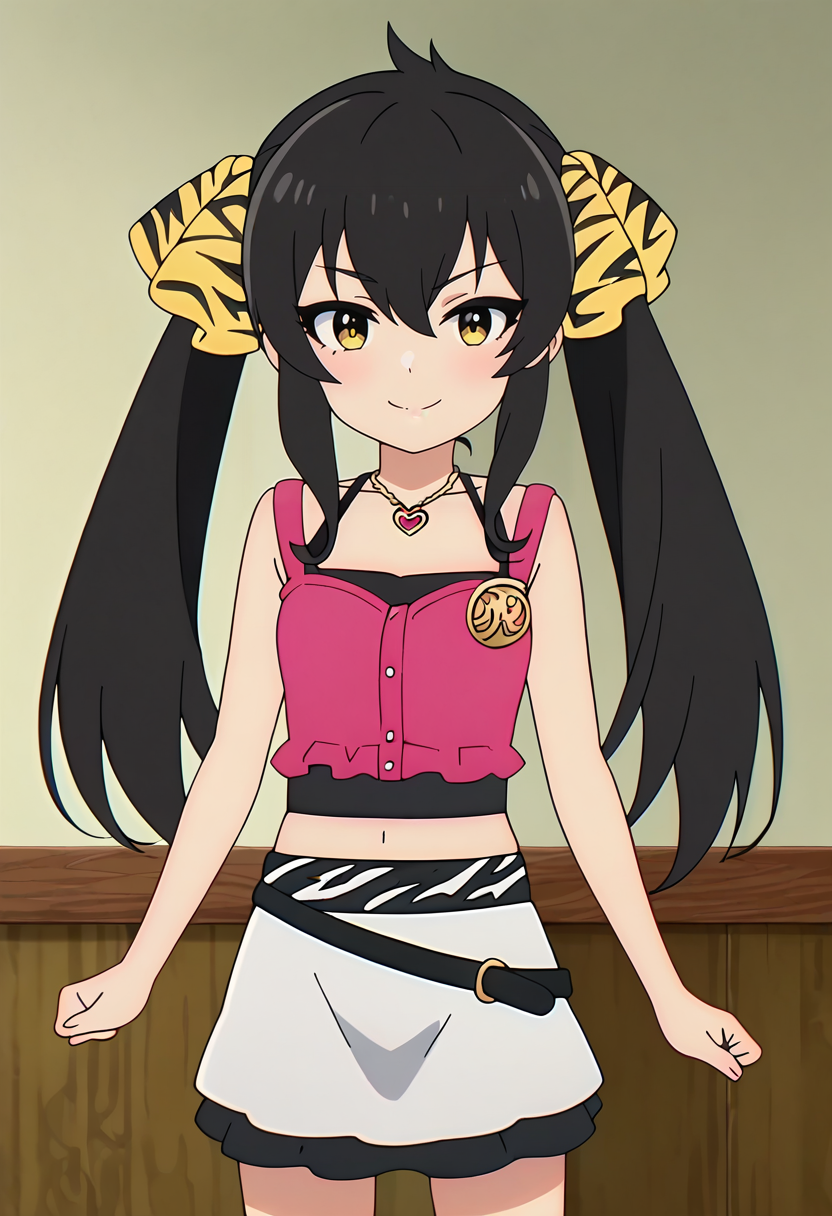 - risamasbase, 黒髪, ツインテール, risaanidefclothes, レオパード柄, 黄色のリボン, ヘアリボン, ハートのネックレス, ピンクのクロップトップ, フリル付きクロップトップ, サイレス, 肩出し, ベルト, 中腹, ミニスカート, 白いスカート, サンダル,