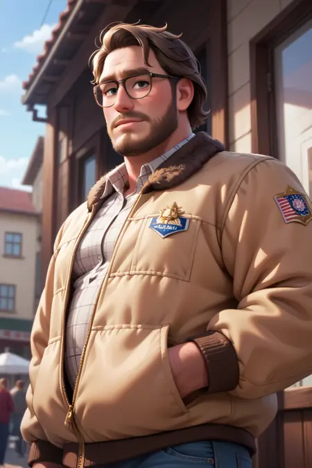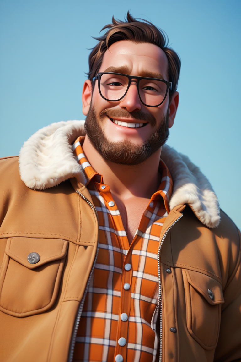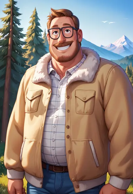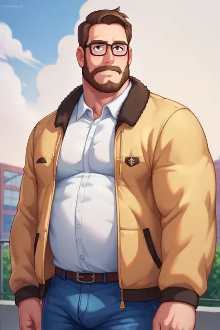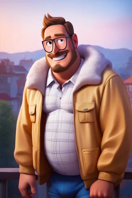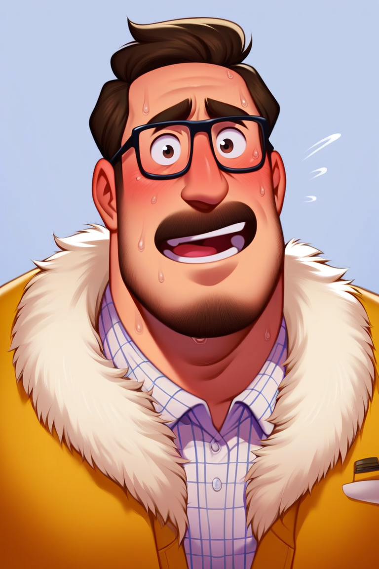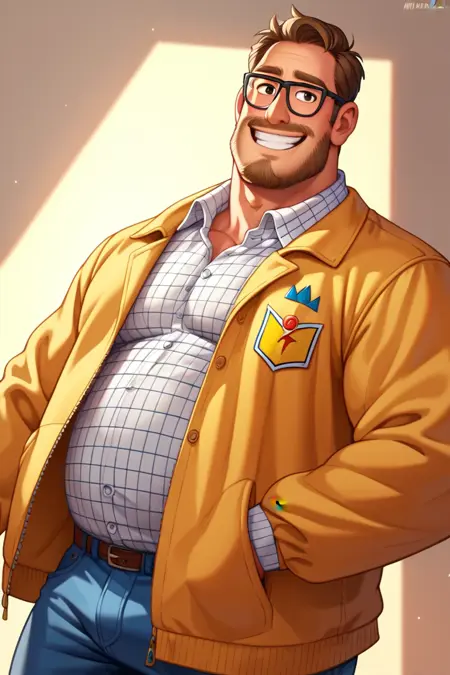 프롬프트: 리크 미첼, 어두운 금발 머리, 어두운 눈, 안면 털, 수염, 콧수염, 약간의 수염, 안경, 통통한 체형, 흰색 체크 무늬 칼라 셔츠, 갈색 털 장식이 있는 노란 자켓, 벌어진 자켓, 청바지, 발목 부츠