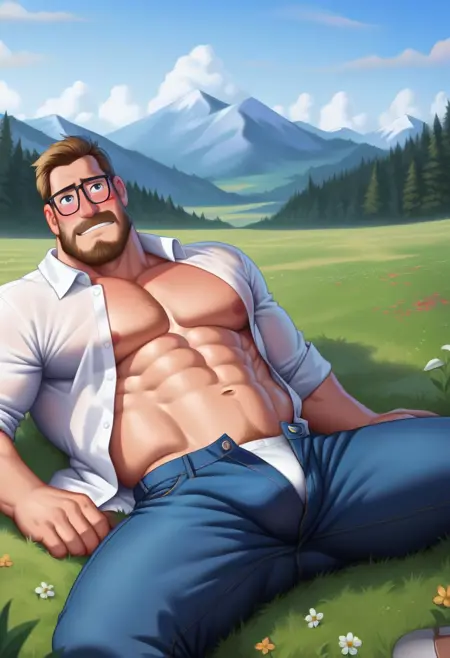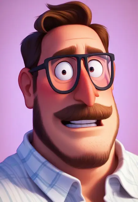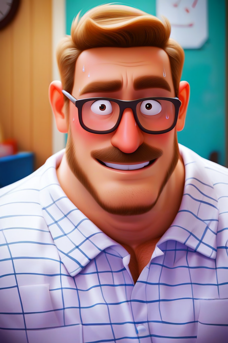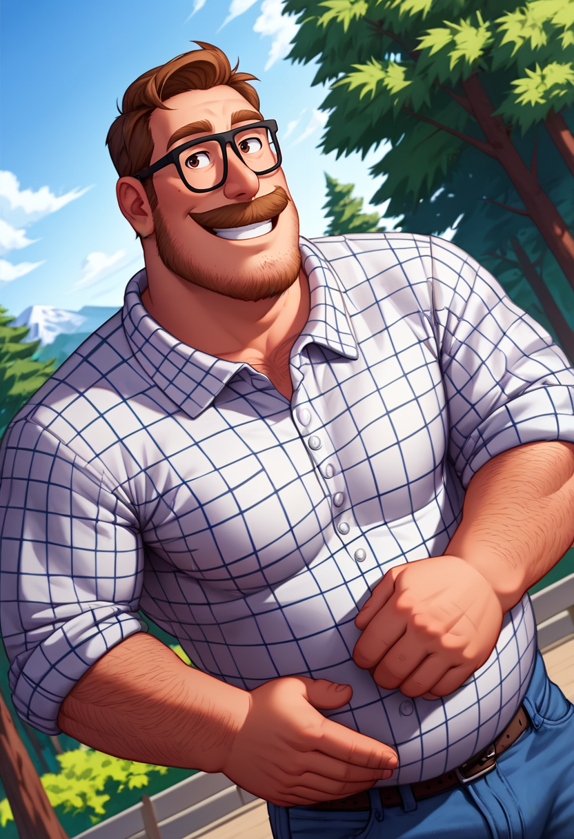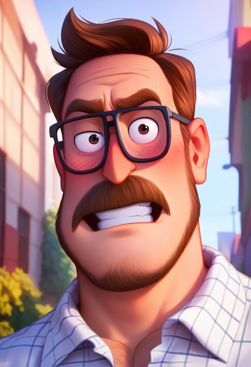 프롬프트: 리크 미첼, 어두운 금발 머리, 어두운 눈, 안면 털, 수염, 콧수염, 약간의 수염, 안경, 통통한 체형, 흰색 체크 무늬 칼라 셔츠, 갈색 털 장식이 있는 노란 자켓, 벌어진 자켓, 청바지, 발목 부츠