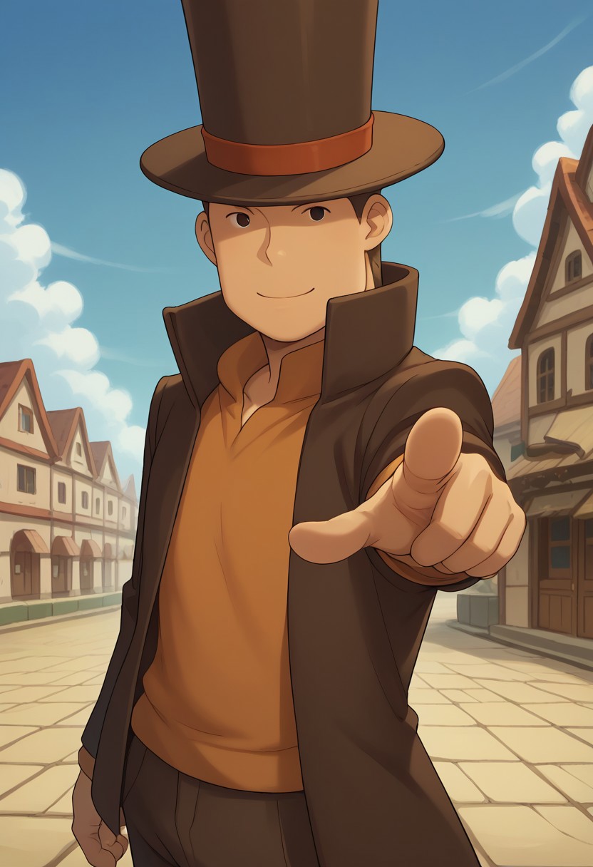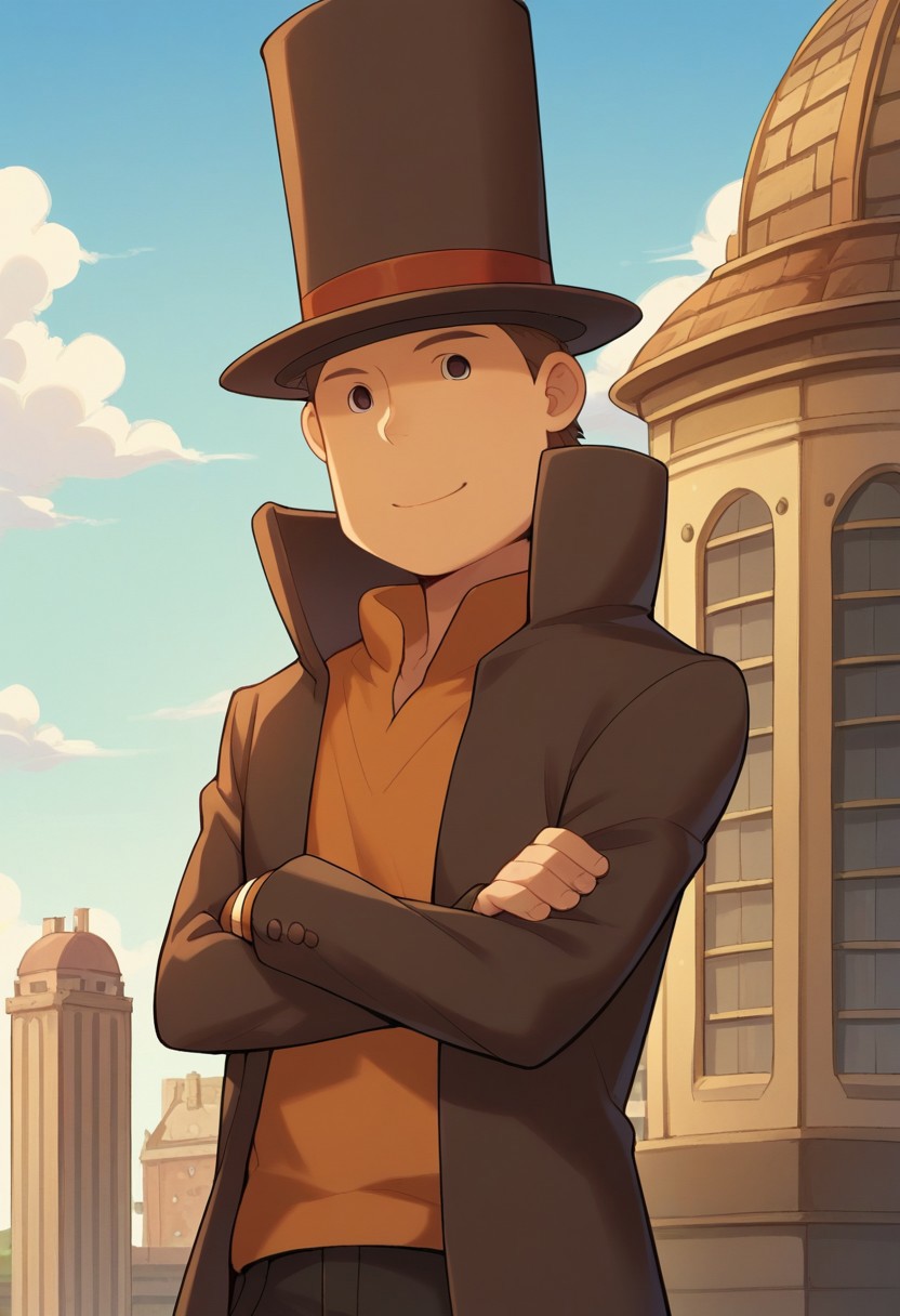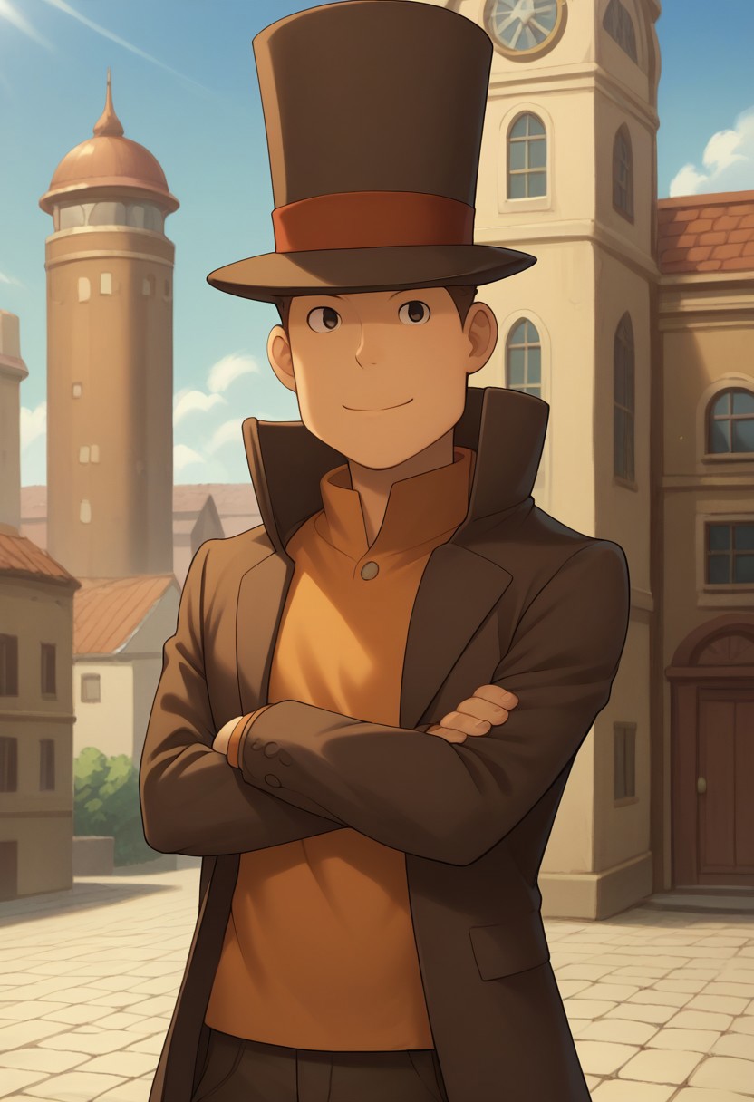 proflayton, hat, 1boy, male focus, top hat, brown hair, shoes, brown shoes, shirt, orange shirt, brown jacket, brown pants,