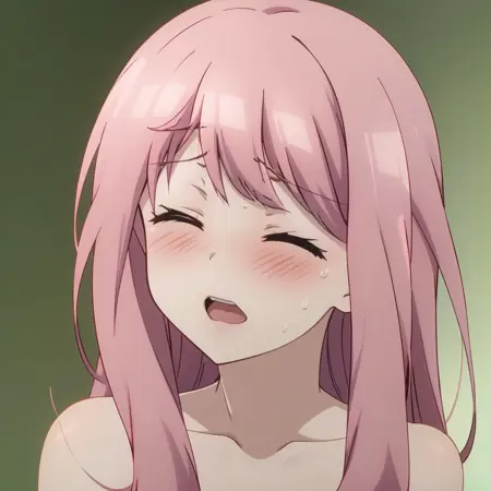 moriyama nanami, 1girl, solo, closed eyes, blush, pink hair, close-up, sweat, closed mouth, long hair, wavy mouth, portrait, bangs