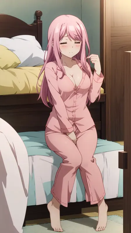 moriyama nanami, 1girl, pink hair, bed, solo, closed eyes, open mouth, pajamas, messy hair, long hair, smile, turn pale, pillow, sitting, hair down, on bed, blanket, under covers, medium breasts, =_=, embarrassed