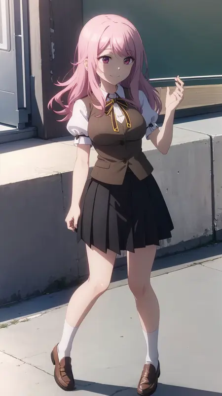 Moriyama Nanami, 1girl, closed eyes, pink hair, school uniform, solo, blush, long hair, open mouth, skirt, short sleeves, homurahara academy school uniform, shirt, vest, neck ribbon, breasts, black skirt, puffy sleeves, bangs, ribbon, white shirt, brown vest, puffy short sleeves, upper teeth only, collared shirt, teeth, medium breasts, brown bow, sweat