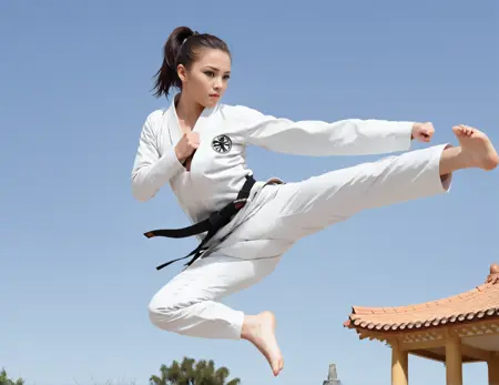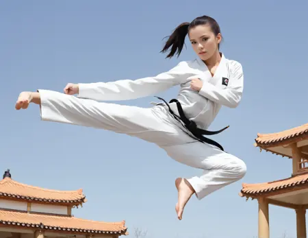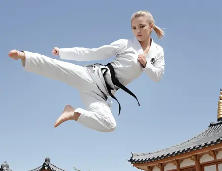 jusiki, 侧面视角, (一位身材纤细的25岁女性) 在佛塔前执行跳跃侧踢。女孩身穿白色空手道服,系黑色腰带,留着长及腰间的棕褐色马尾辫...