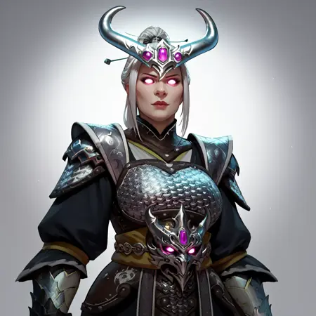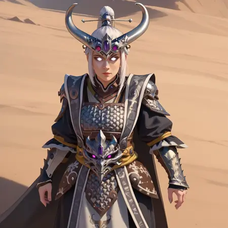MiaoYingMortal, blank eyes, glowing eyes, white hair, jewelry, helmet, horns, armor, dress,