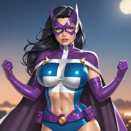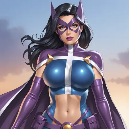 트리거: huntressdccomics, 1girl, solo, black hair, superhero, large breasts, mask, utility belt, cape, long hair, elbow gloves, navel, midriff, blue eyes, purple gloves, lips, lipstick, makeup, belt pouch, crop top, leotard, giant breasts