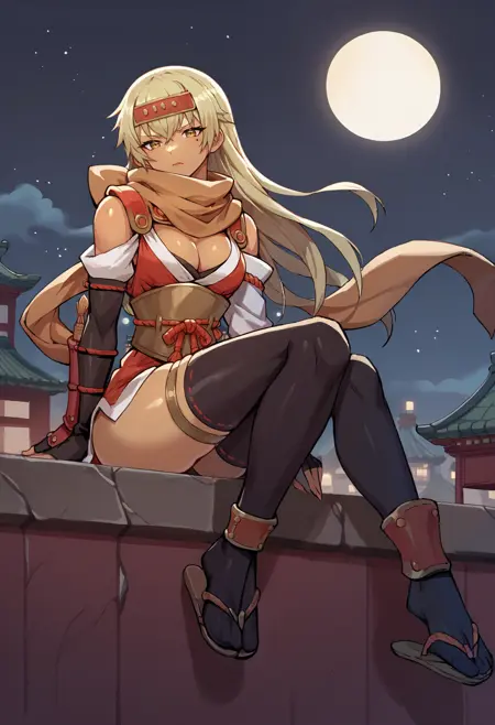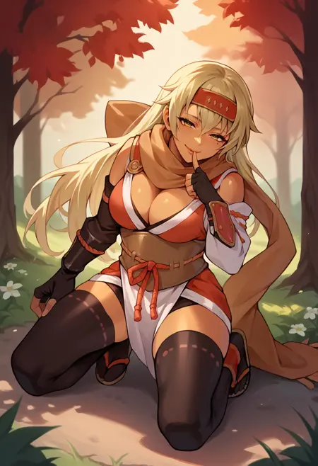 ナバタの忍者(FEH): ninIgrene、長髪、ヘッドバンド、目の下のほくろ、肌の黒い女性、忍者、谷間、大きな胸、茶色のスカーフ、黒い肘手袋、指なし手袋、片袖、片腕ガード、骨盤カーテン、太ももストラップ、黒い太ももハイソックス