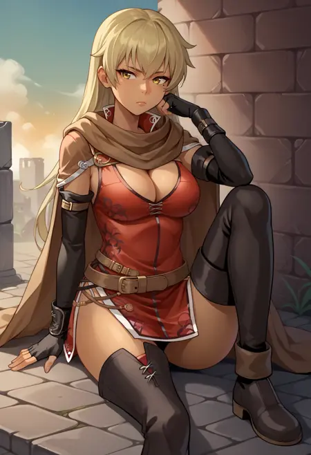デフォルト外見: defIgrene、長髪、目の下のほくろ、肌の黒い女性、チャイナドレス、大きな胸、谷間、茶色のマント、黒い肘手袋、指なし手袋、手首ガード、ベルト、太ももブーツ、黒い靴