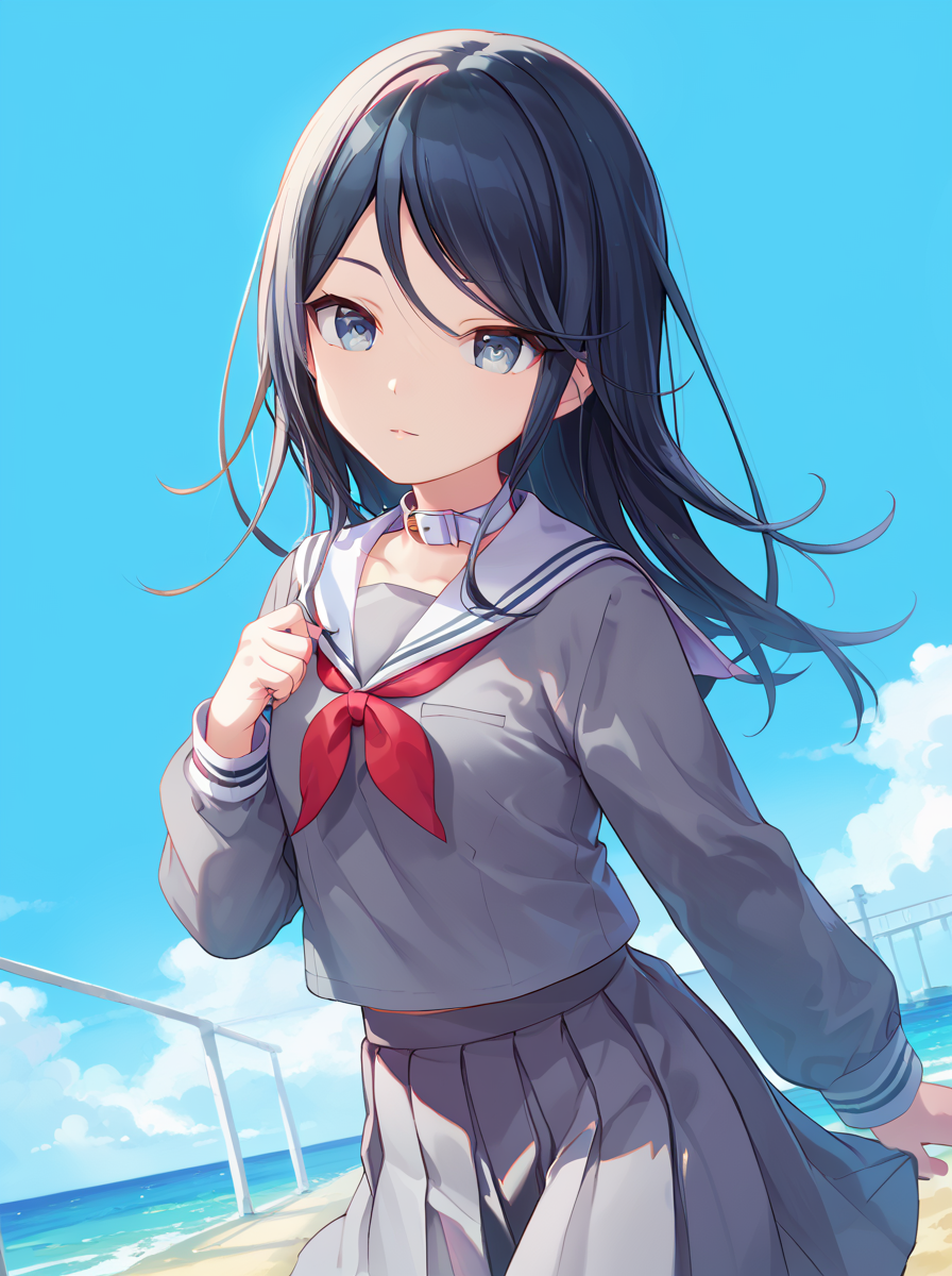 호시노 이치카, 긴 머리, 검은 머리, 곧은 머리, 젖힌 앞머리, 파란 눈, 회색 눈