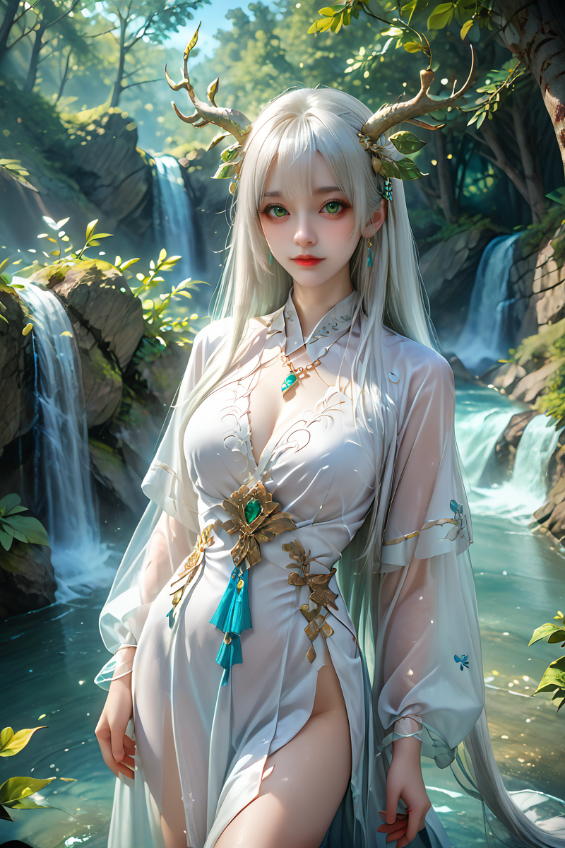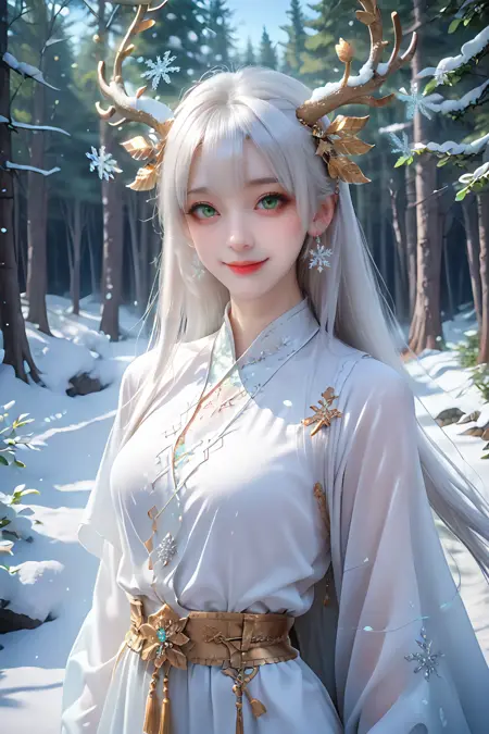 《완벽한 세계》 및 그 파생 작품의 캐릭터. 흰색 선녀로 변신하여 흰색 긴 치마와 노란색 벨트를 입고, 은색 머리카락이 자연스럽게 흐르며, 머리에는 녹색 등나무가 자라고, 뒤에는 거대한 등나무가 떠 있다.