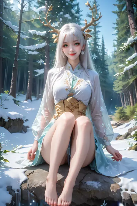 허천신등 《완벽한 세계》 및 그 파생 작품의 캐릭터. 흰 옷의 선녀로 변신하여 흰색 긴 치마를 입고 노란색 벨트를 두르며, 은색 긴 머리카락이 자연스럽게 흐르고, 머리에는 녹색 등나무가 자라고, 뒤에는 거대한 등나무가 떠 있다.