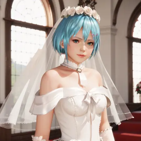 衣装2:ウェディングドレス、ブライダルベール、ブライダルガントレット、白いチョーカー、白いタイザーハイソックス、ハイヒール