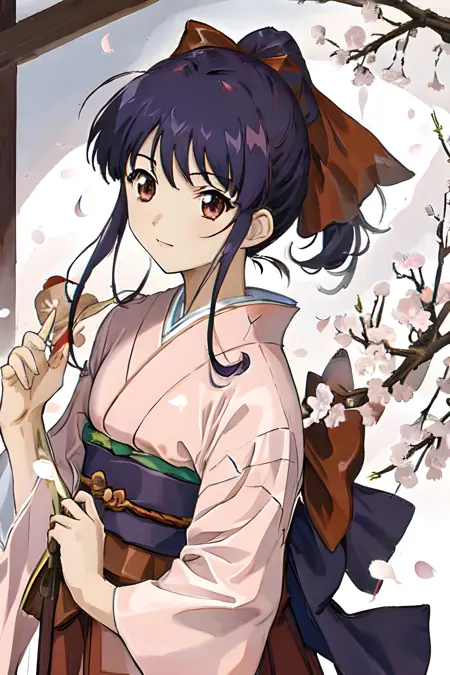 トリガー語: shinguuji sakura, red bow, dark blue hair, pink dress, Kimono