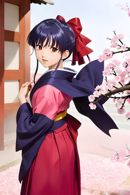 召唤词: shinguuji sakura, red bow, dark blue hair, pink dress, Kimono