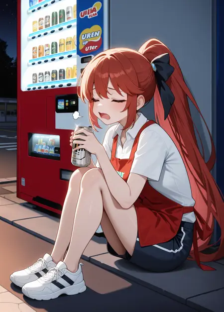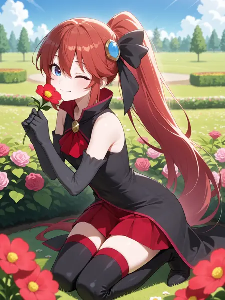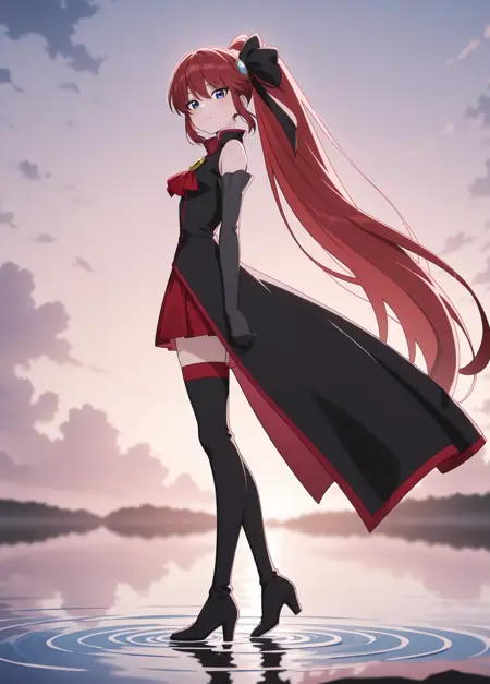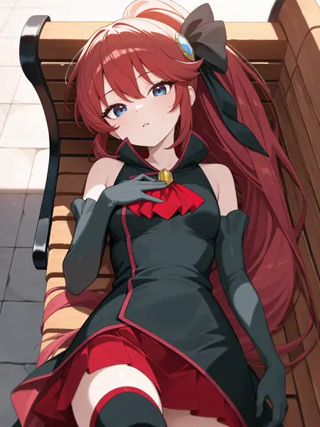 태그: uunlovely, 긴 검은 드레스, 헤어보우, 빨간 스커트, 브로치, 팔꿈치 장갑, 허벅지 양말, 허벅지 부츠