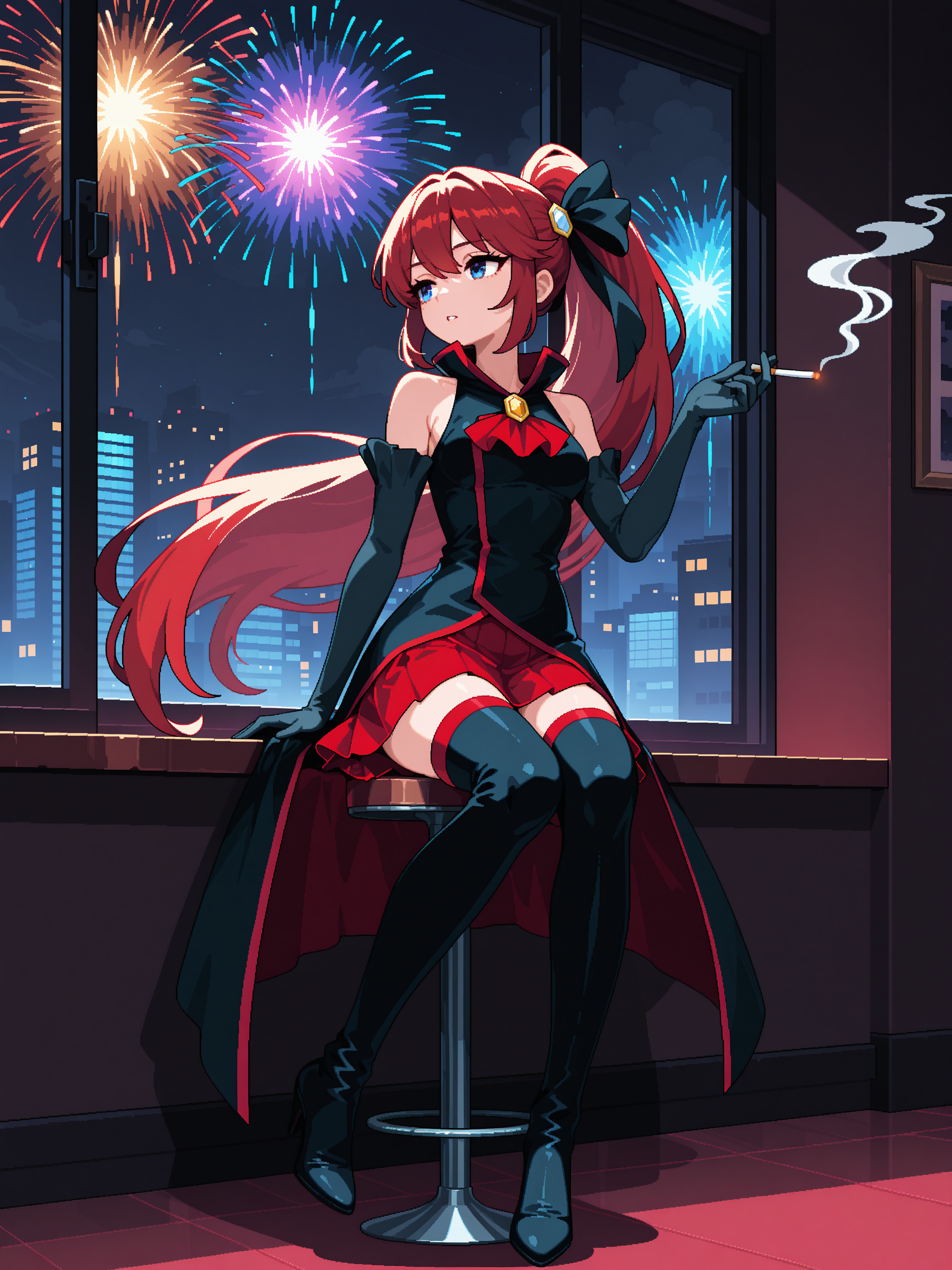 옷 태그: 긴 검은 드레스, 빨간 스커트, 브로치, 팔꿈치 장갑, 허벅지 부츠