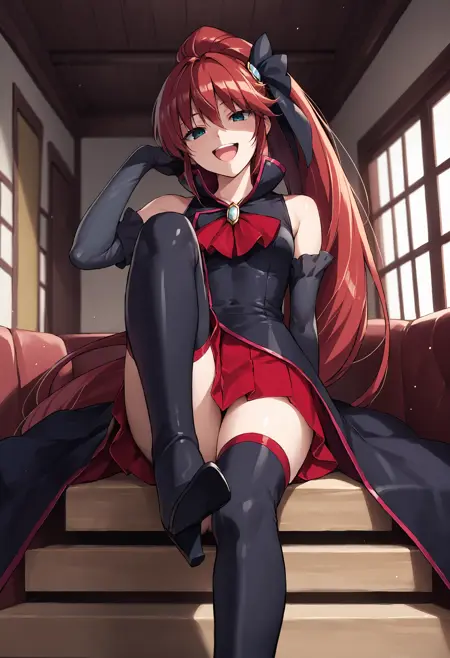 Outfit Tags: long black dress, red skirt, brooch, elbow gloves, thigh boots