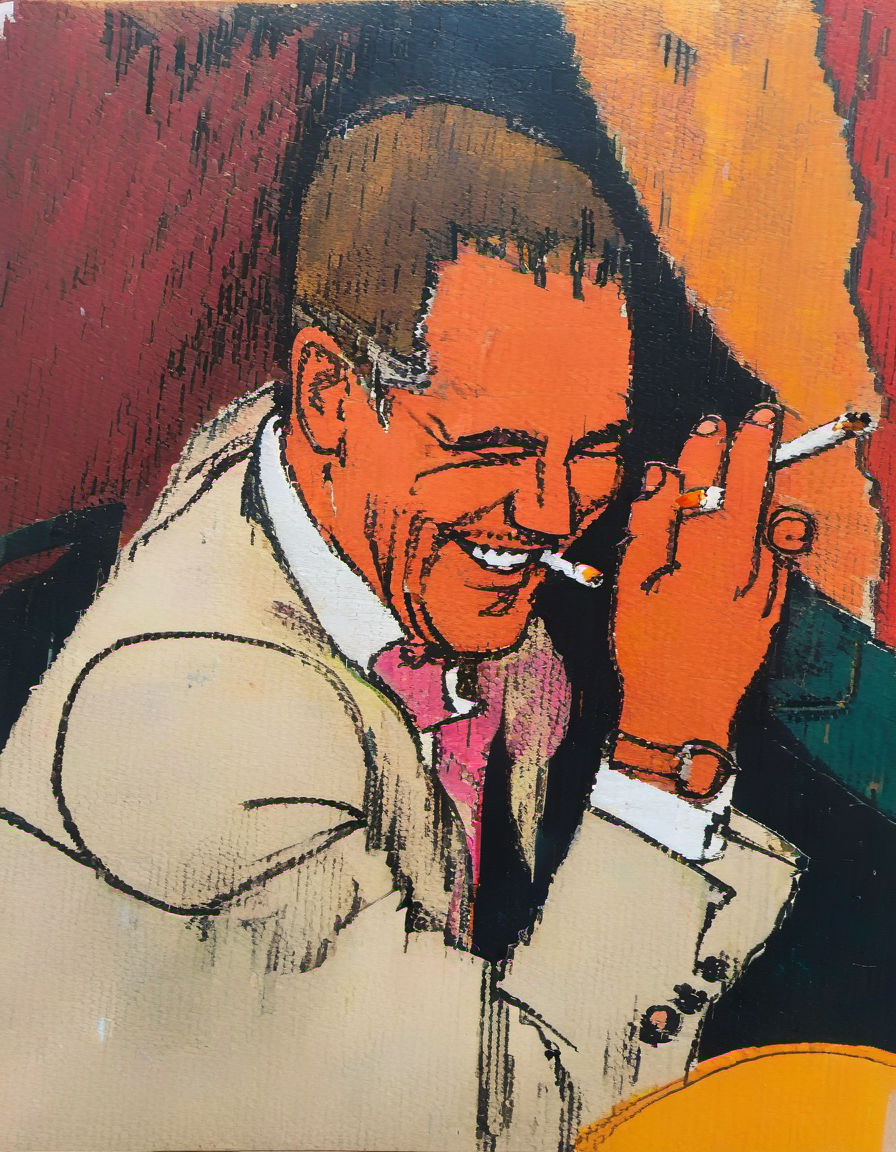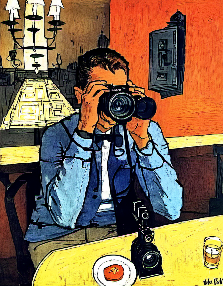以 bob-peak 风格绘制的坐在桌子旁拿着相机的男人插图
