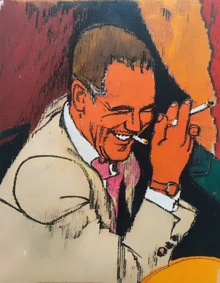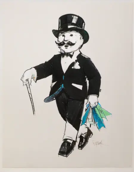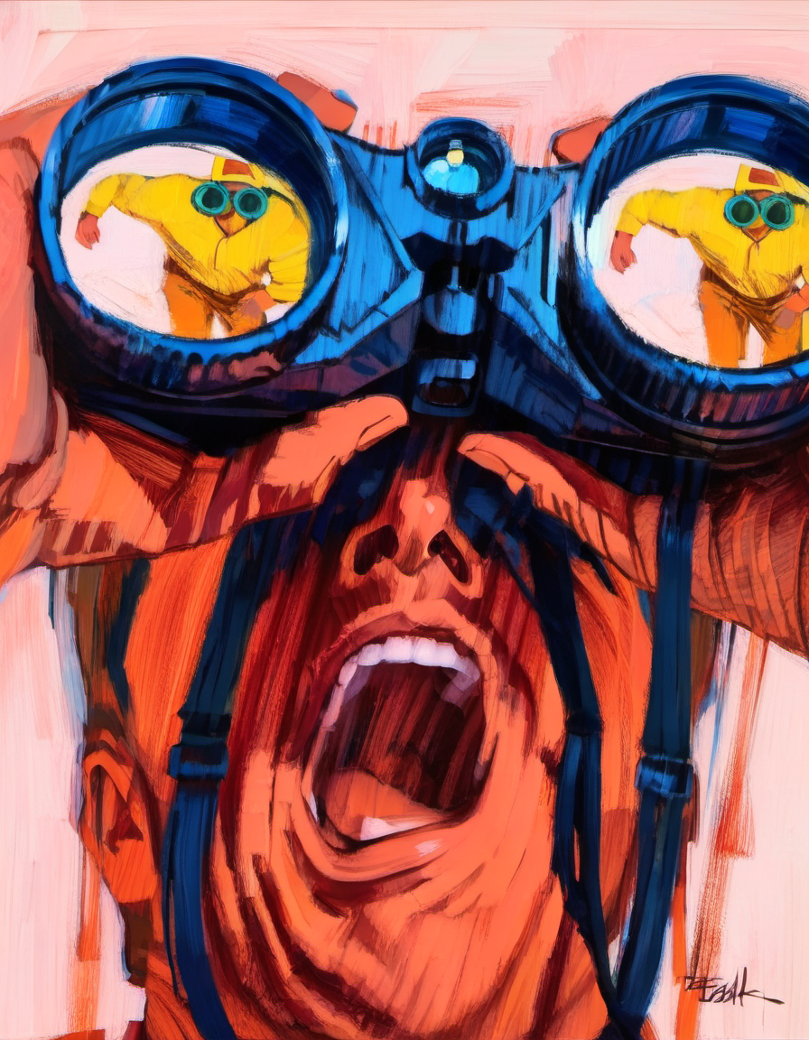 以 bob-peak 风格绘制的坐在桌子旁拿着相机的男人笔触插图