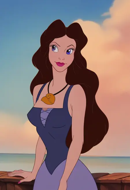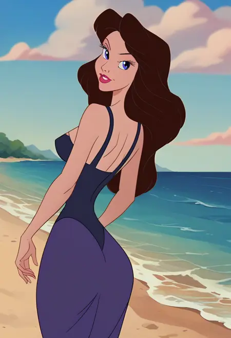 我训练的LoRA基于《小美人鱼》中乌苏拉使用的人类伪装版本,此版本为小马形态。LoRA使用与动画电影风格相同的图像数据集进行训练。所有电影中的服装(白色连衣裙、紫色连衣裙、婚纱)均已训练完成,且几乎无需额外提示即可生效。