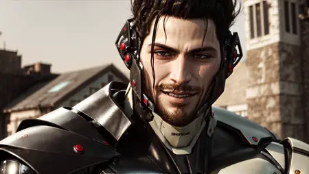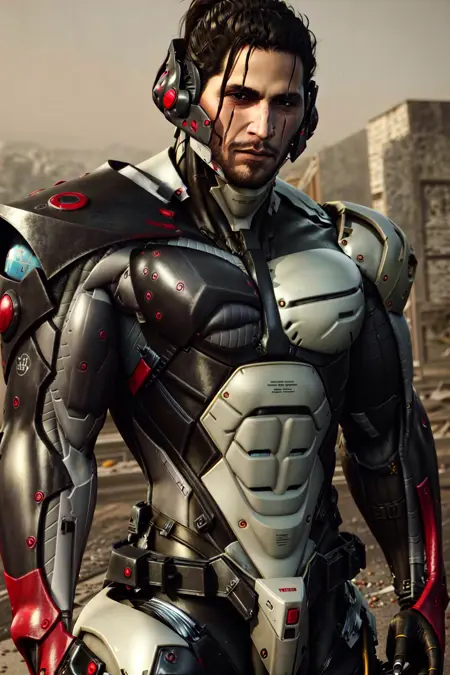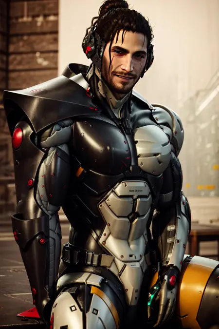 (1boy, solo:1.5), facial hair, male focus, beard, cyborg, scar, scar on face