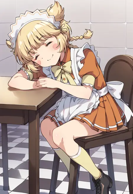 fong pudding, waitress, blonde hair, brown hair, short hair, hair flaps, twintails, twin braids, brown eyes, yellow eyes, eyebrows visible through hair, orange dress, frilled dress, orange skirt, pleated skirt, puffy short sleeves, maid headdress, hair ribbon, yellow ribbon, maid apron, white apron, frilled apron, yellow neckwear, yellow bowtie, yellow bow, frills, yellow socks, black footwear, boots