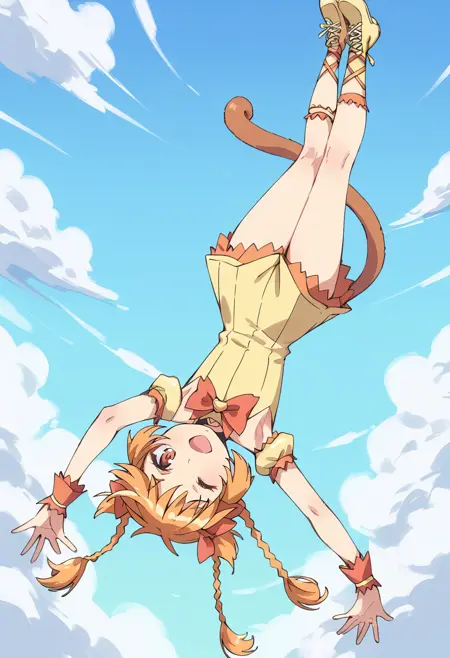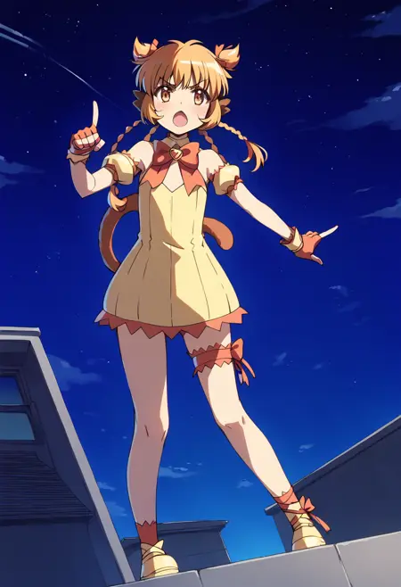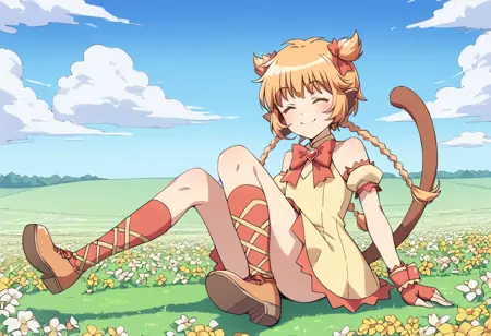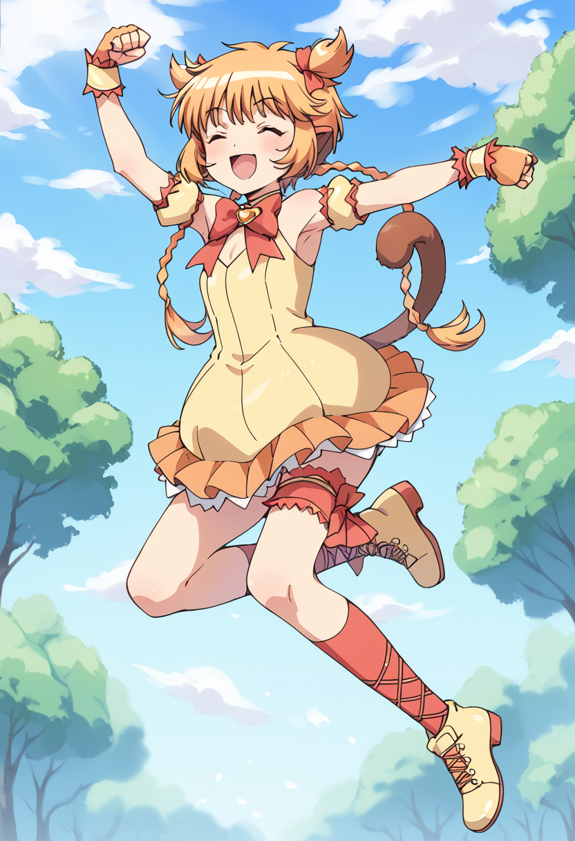 mew pudding, blonde hair, brown hair, orange hair, short hair, twintails, twin braids, two side up, brown eyes, orange eyes, monkey ears, eyebrows visible through hair, eyelashes, hair ribbon, red bow, yellow dress, puffy detached sleeves, puffy short sleeves, brooch, detached collar, yellow choker, bowtie, red neckwear, orange gloves, fingerless gloves, wrist cuffs, bridal garter, monkey tail, ankle lace-up, footwear ribbon, orange legwear, socks, yellow footwear, shoes