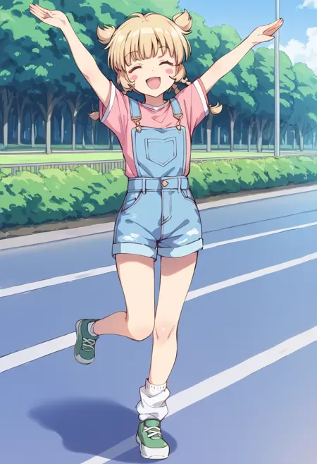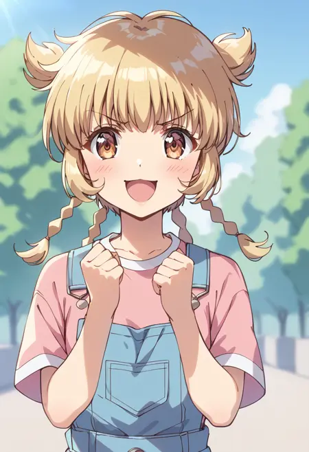 fong pudding, blonde hair, brown hair, short hair, hair flaps, twintails, twin braids, two side up, brown eyes, yellow eyes, eyebrows visible through hair, eyelashes, blue overalls, pink shirt, t-shirt, overall shorts, denim shorts, suspender shorts, white legwear, loose socks, white socks, green footwearCasual clothes pattern 2 私服その2