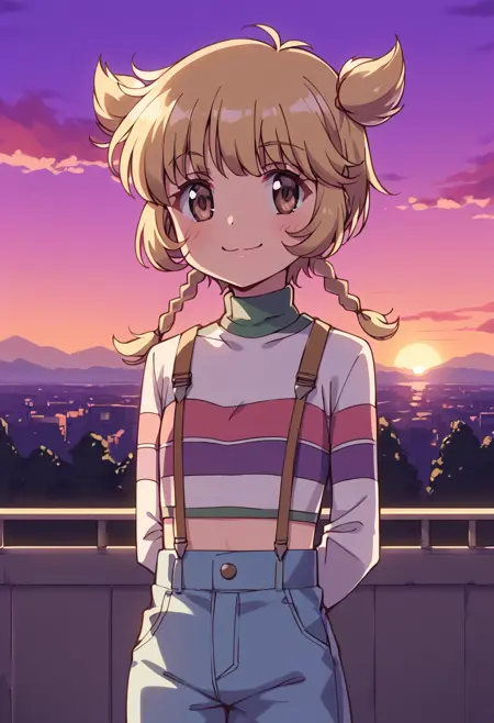 fong pudding, blonde hair, brown hair, short hair, hair flaps, twintails, twin braids, two side up, brown eyes, yellow eyes, eyebrows visible through hair, eyelashes, white shirt, striped shirt, cropped shirt, suspender skirt, blue pants, denim, blue legwear, yellow footwear, midriffCasual clothes pattern 3 私服その3
