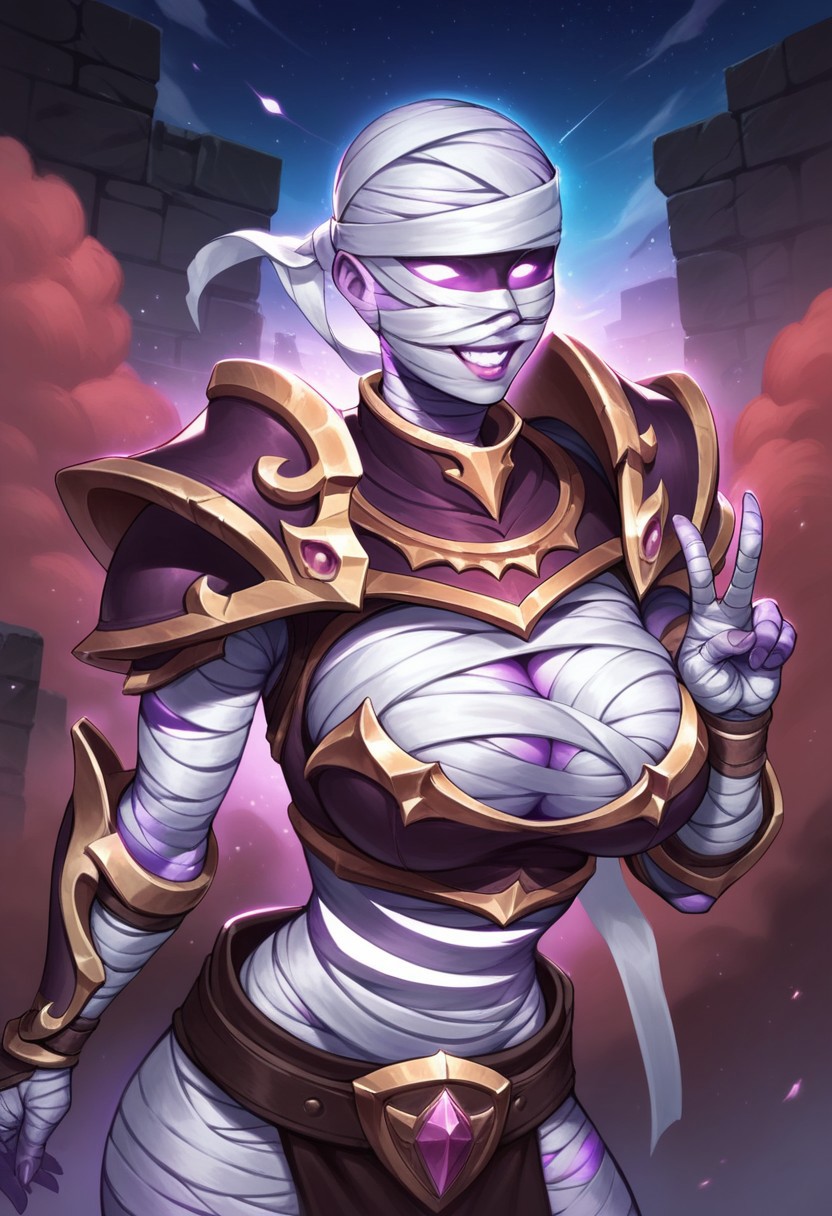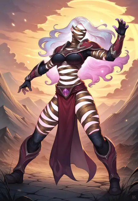 • Character Tags: Ethereal body, magical creature, hollow body, glowing body, magical body, wrapped face, featurless eyes, no skin, wrapped in bandages, mummy, earless, mouthless, (your color*) body,