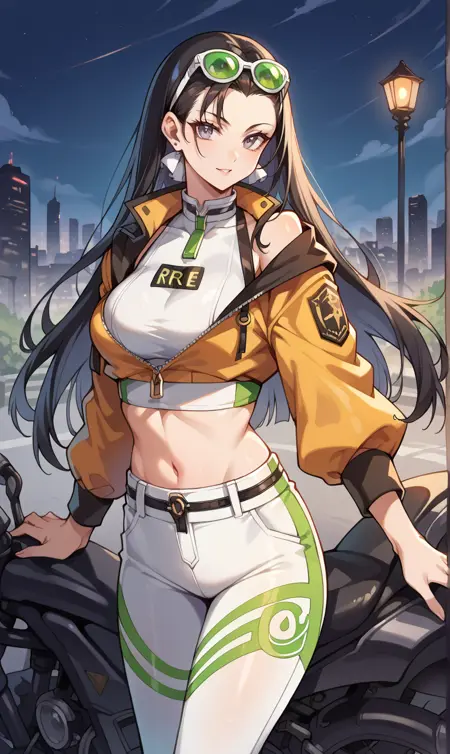 바이커 복장: "ChizuruKOF, 긴 머리, 뒤로 빗어넘긴 머리, 짧은 재킷, 흰색 크롭탑, 복부, 흰색 레깅스, 머리 위에 녹색 틴트 된 안경"