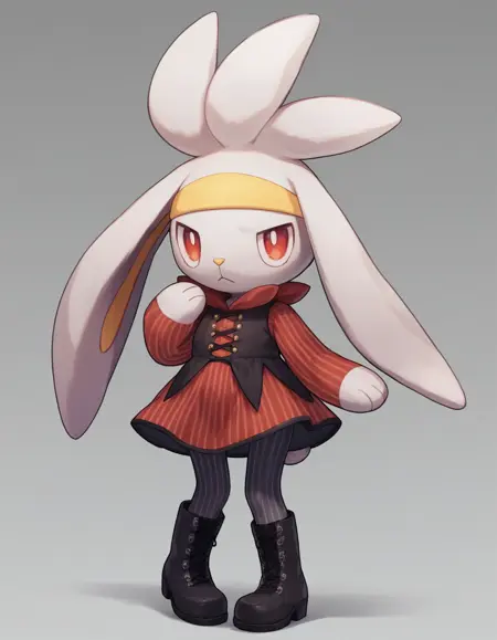 基础提示词: raboot, 白色皮毛, 下垂的耳朵, 兔耳朵, 兔尾巴, 红眼睛, 看着观众, 毛茸茸的雌性, 黄色发带