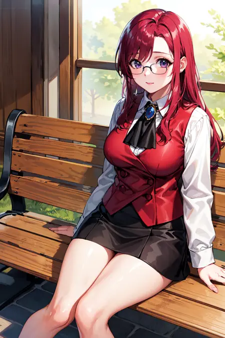 outfit (normal)km1, 1girl, red hair, sidelocks, brooch, jewelry, ascot, red vest, miniskirt, black_skirt, long sleeves, glasses