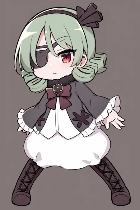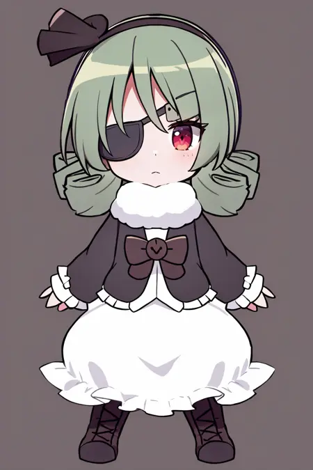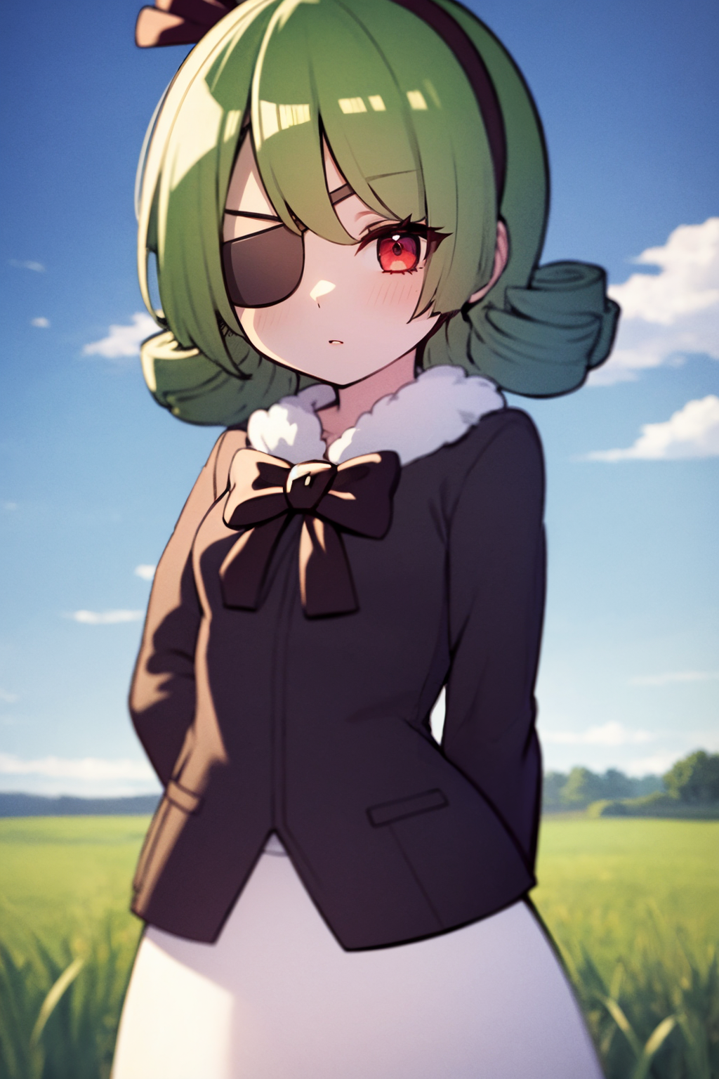 基本プロンプト:1girl, krilalaris, green hair, bangs, black hairband, red eyes, eyepatch