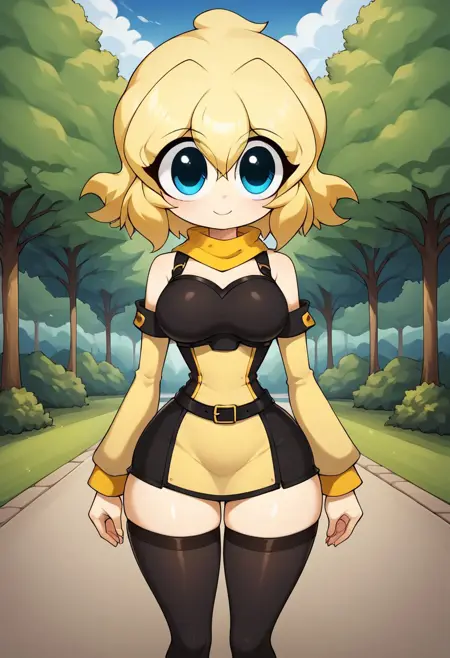 Yellow dress, long black stockings, yellow gloves, separate sleeves,