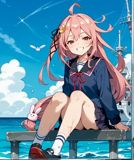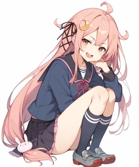 uzuki (kantai collection), pink hair, red eyes, low-tied long hair, ahoge, crescent hair ornament, rabbit hair ornament, hair ribbon, school uniform, serafuku, black shirt, neck red ribbon, long sleeves, pleated skirt, black skirt, striped calf socks, gray shoes