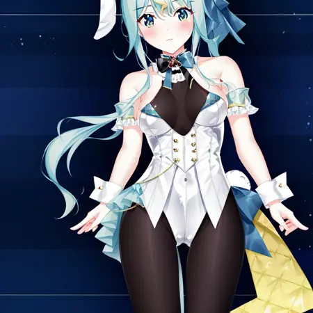 Body: playboy bunny, wrist cuffs, pantyhose, leotard, bare shoulders, white leotard, black pantyhose, medium breasts, see-through cleavage