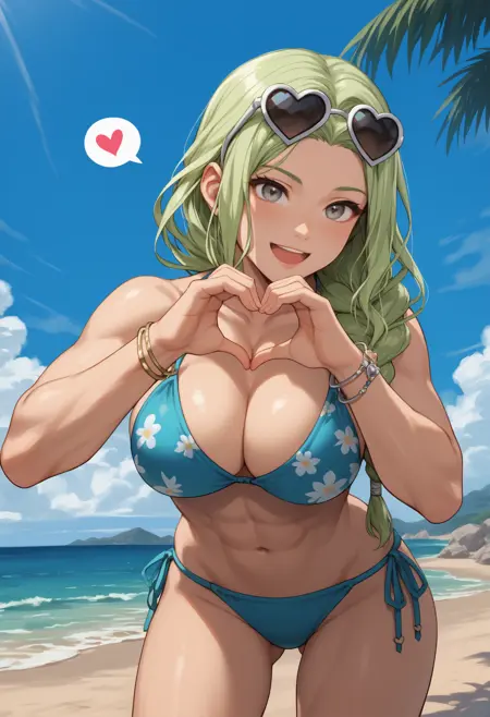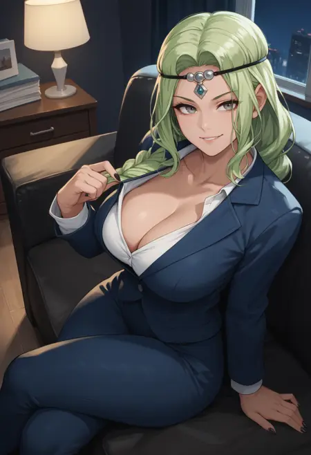 常に必要: "FENottRND、灰色の瞳、緑の髪、長い髪、片方の編み込み、大きな胸、引き締まった体型"