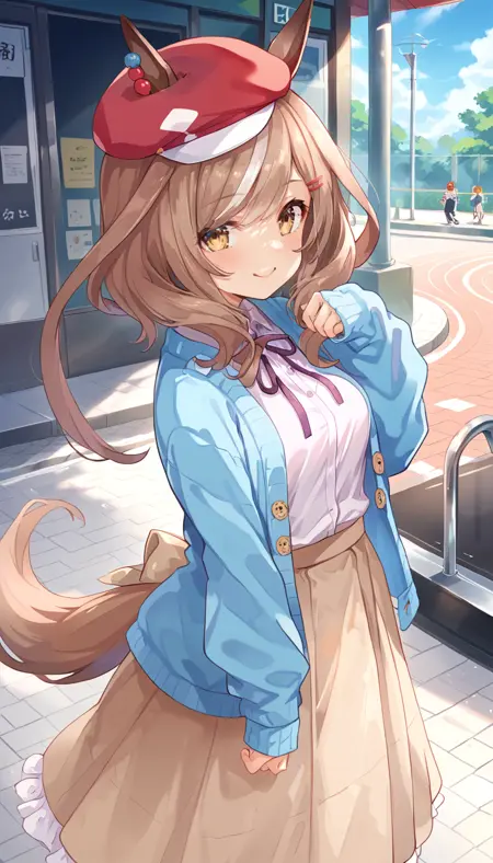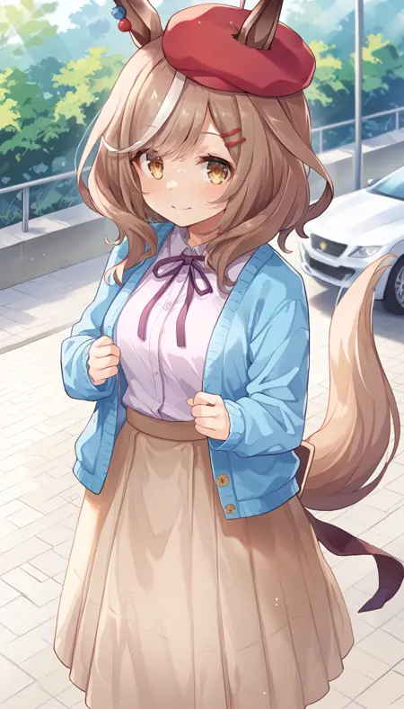 黄色眼睛, 贝雷帽, 蓝色针织开衫, 棕色裙子, 针织开衫, 衬衫塞进裙子里,