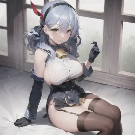 1girl, ako, long sleeves, hair between eyes, hairband, bell, sideboob, garter straps, halo, neck bell