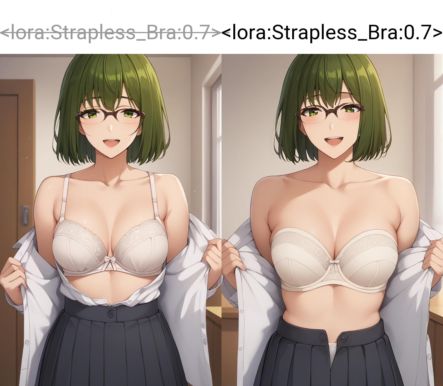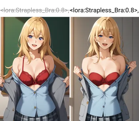如果“无肩带胸衣”提示不起作用,这个LoRA可能会有帮助。
