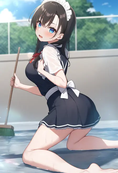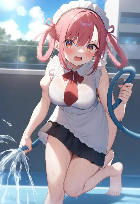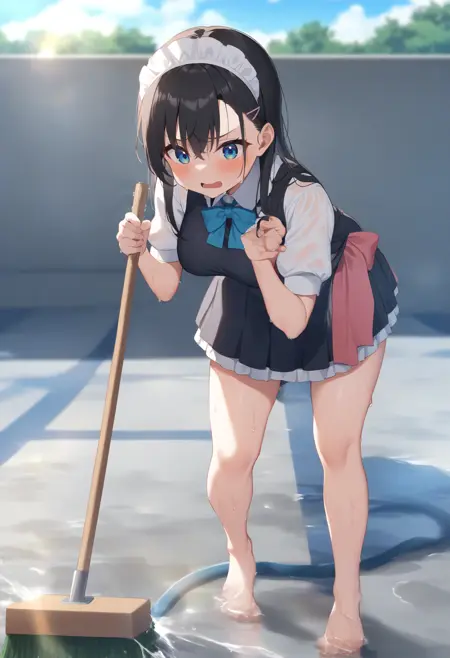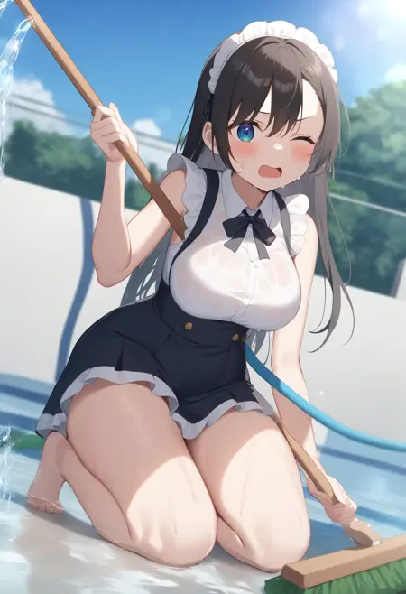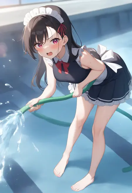 状況的に、pool、water、day、outdoors、wet、sky、sunlight、wet clothes、water drop、splashing、lens flare、wet hair、sweatdrop などから必要な要素を追加してください。服装は水着でも体操着でも制服でもお好みで構いません。その後、holding hose、hose と broom、barefoot、holding broom、cleaning のいずれか、または両方を用いて、ブラシまたはホースを持たせます。