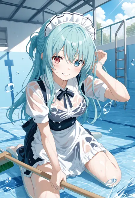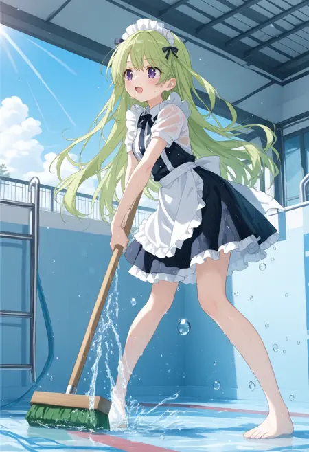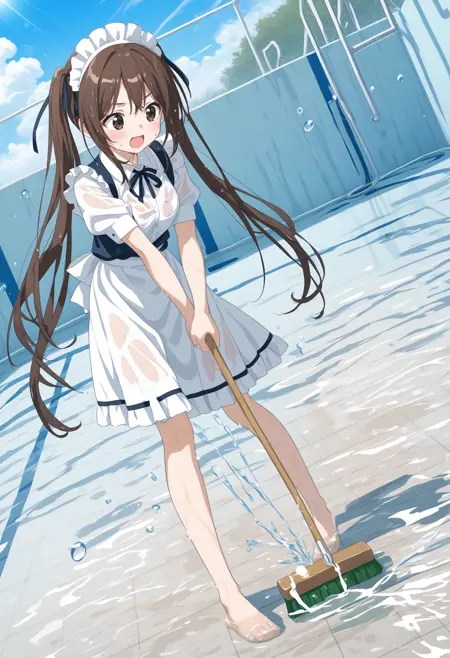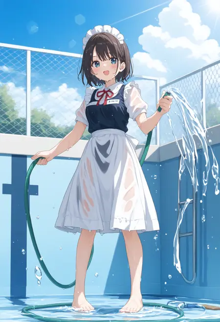 状況的に pool, water, day, outdoors, wet, sky,sunlight, wet clothes, water drop, splashing, lens flare, wet hair, sweatdrop 辺りから必要なものを入れ、服装は水着でも体操着でも制服でも好きなものを、後は holding hose ,hose と broom, barefoot, holding broom, cleaning のどちらかもしくは両方でブラシやホースを持ちます。